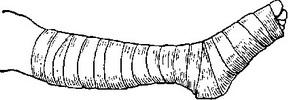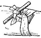 Кінці кровоспинного джгута з'єднують, заводячи гачок за одне з кілець ланцюжка. Стрічковий джгут (рис. 3) - гумова смуга шириною близько 3 див. Накладають його, як і джгут Есмарха. Для зупинки кровотечі з судин верхньої кінцівки і знекровлення кінцівок під час операцій застосовують стрічковий джгут, виготовлений з тонкої еластичної гуми шириною 5-6 см (рис. 4). Накладають його на попередньо підняту кінцівку спіральними ходами від периферії до центру (рис. 5), закріплюють, зав'язуючи кінці вузлом самого джгута або спеціальної тасьмою-зав'язкою на одному з його кінців. |