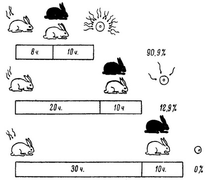 Для визначення часу, протягом якого зберігається запліднююча здатність сперматозоїдів, що перебувають у статевому тракті кролиці, Hammond справив наступні досліди. Відомо, що овуляція у кролиці настає через 10 год після покриття її самцем. Ввівши штучно сперматозоїди у піхві кролиці, автор потім покривав її самцем, у якого хірургічним шляхом був перев'язаний сім'явивідний протока. Таким чином, самець при покритті самки не міг виділити своїх сперматозоїдів і, якщо вагітність наступала, то, отже, від тих сперматозоїдів, які були штучно введені у піхву. Покриваючи таким самцем самок в різний час після їх штучного осіменіння, Гаммонд встановив час життєздатності сперматозоїдів. На рис. 149 представлено досвід Гаммонда. В результаті цих дослідів було встановлено, що найбільша запліднююча здатність сперматозоїдів, що перебувають у статевому тракті кролиць, зберігається протягом 18 год, так як тільки в межах цього часу вагітність наступала у 90,9%.