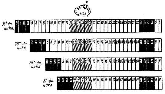 Час можливого зачаття ще менш вивчений, так як не існує методів, з допомогою яких можна було б встановити момент овуляції, наступ якої у жінки піддається численним коливань. Виходячи з передбачуваних даних про термін життєздатності яйцеклітини, найбільша ймовірність зачаття можлива в певні дні менструального циклу. Так, при 32-денному циклі цей момент збігається з 16-20 днів, при 28-денному - 12-16 і т. д. Ці особливості показано на рис. 150 (цит. за К. К. Скробанскому).