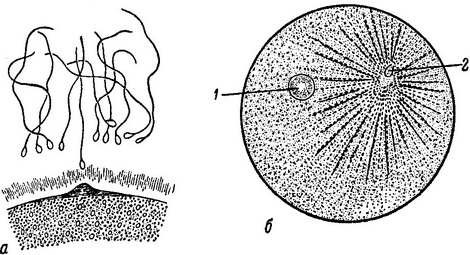 а - освіта сприймає горбка проти найближчого сперматозоїда; б - зближення ядер: 1 - ядро яйцевої клітини, 2 - ядро сперматозоїда.