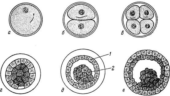 Рис. 152. Схема послідовних стадій дроблення зиготи (а-е).