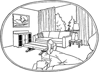 Рис. 3.12. Цей малюнок зображує зорове поле правого ока; ніс і губа видно зліва; тіло спостерігача видно у нижній частині зорового поля (За Е. Маху, 1885). |